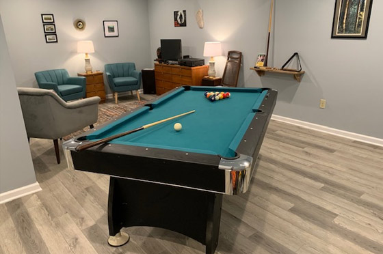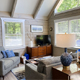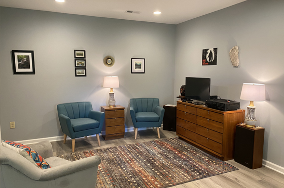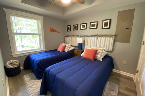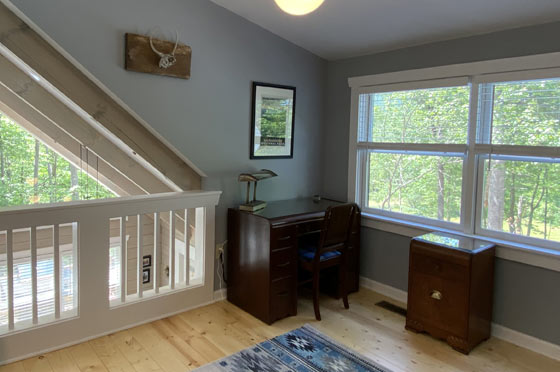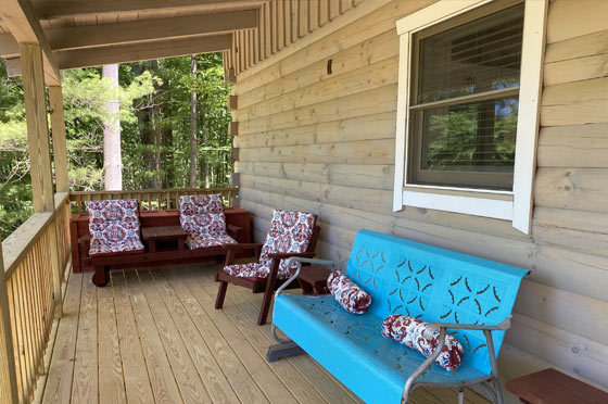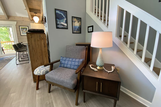 The two bedroom/three bath, three-floor cabin sleeps at least six (though more are possible, living room couch is ample, and there is room in Rec Room for air mattresses). The furnishings are mostly antiques from the 1920s-1960s, Art Deco and Mid-Century Modern. The kitchen is fully equipped. The main floor is thoroughly accessible for those with mobility issues, including walk-in shower with seat and grab bars. There is a main-floor laundry.