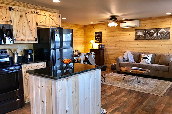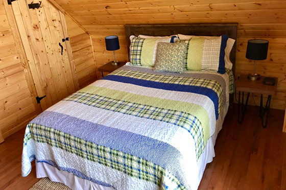 Bed sizes are: queen (master), full bed with full size trundle (2nd bedroom), two full bathrooms, children's loft area/ reading nook (air mattress included), double decks, hot tub, Dish TV, fully stocked kitchen, farmhouse sink with granite countertops, washer/dryer, fire pit, charcoal grill, pet friendly, and coffee in cabin.