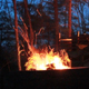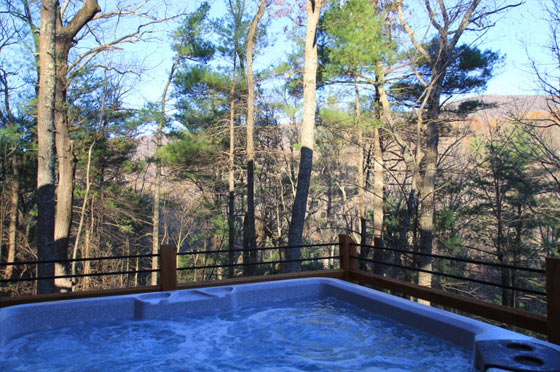 This cabin features a queen bed, a gas wood stove, a hot tub, and a lovely view of the quiet forest.